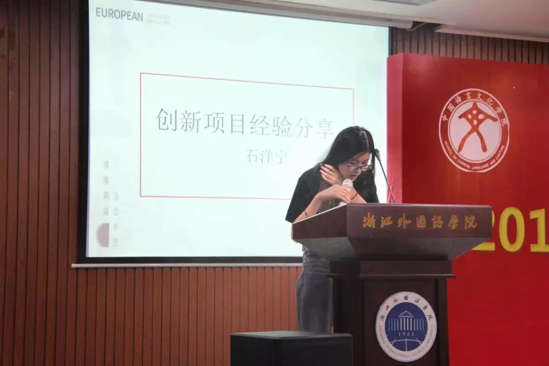 新生选择有意义的社会实践提供了宝贵经验;朱烜即欧罗外语创始人分享了创业经验,让在座的新生受益匪浅;余均涛和杨爽两位同学分享了各自的留学经验,为新生介绍了学习小语种的作用,从兴趣、学习方法,心态等多方面传授学习一门外语的经验,并寄语“脚踏实地,仰望星空”。最后,石洋宁进行了创新项目经验分享,低端影视