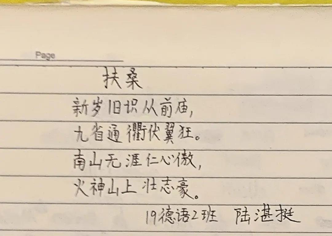 在这次疫情中,我深受感动的有几个点:一是钟南山院士的国士无双;二是我们祖国的强盛,能在短短十小时内建起了火神山医院;三则是在危难关头各族人民团结一心,共同抗议的爱国情怀,因此我把他们放入了写作的内容中。同时“扶桑”象征着光明,“祈盼”代表了个人的衷心祝愿,希望一切都能重现生机。
