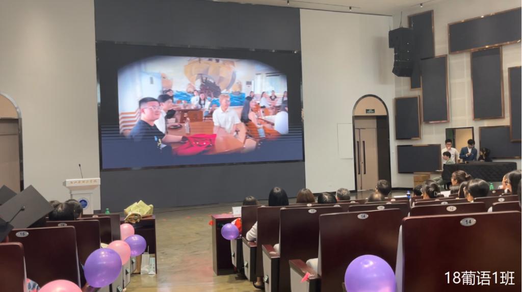 “班级展示篇”为10个毕业班四年大学时光的回顾展示及班主任、教官赠言,由毕业生代表18西班牙语中外合作班毕业生易路锦、19俄语2班黄勇健主持。