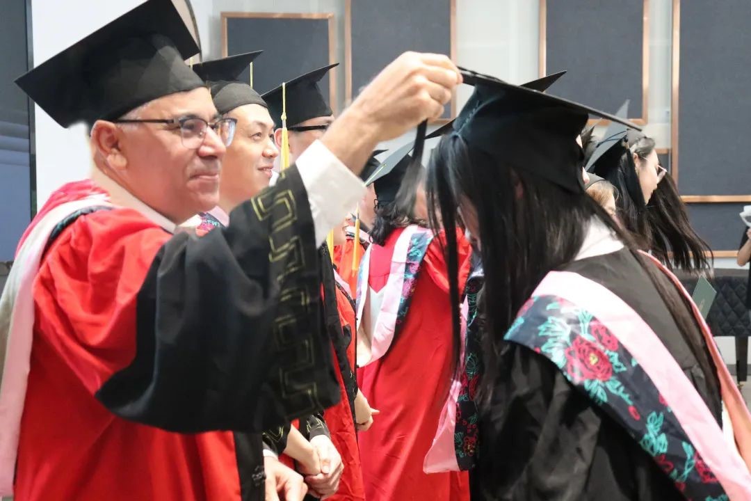 学位授予仪式环节在校歌声中进行,马卫红教授、李磊荣教授、毕莹书记、王忆停副院长、张禄彭副院长、外籍专家施若杰博士、孟玉秋博士、甘甜博士、孔琳副教授、章吟副教授、周梦琪博士,为毕业生们拨穗并授予学位证书。
