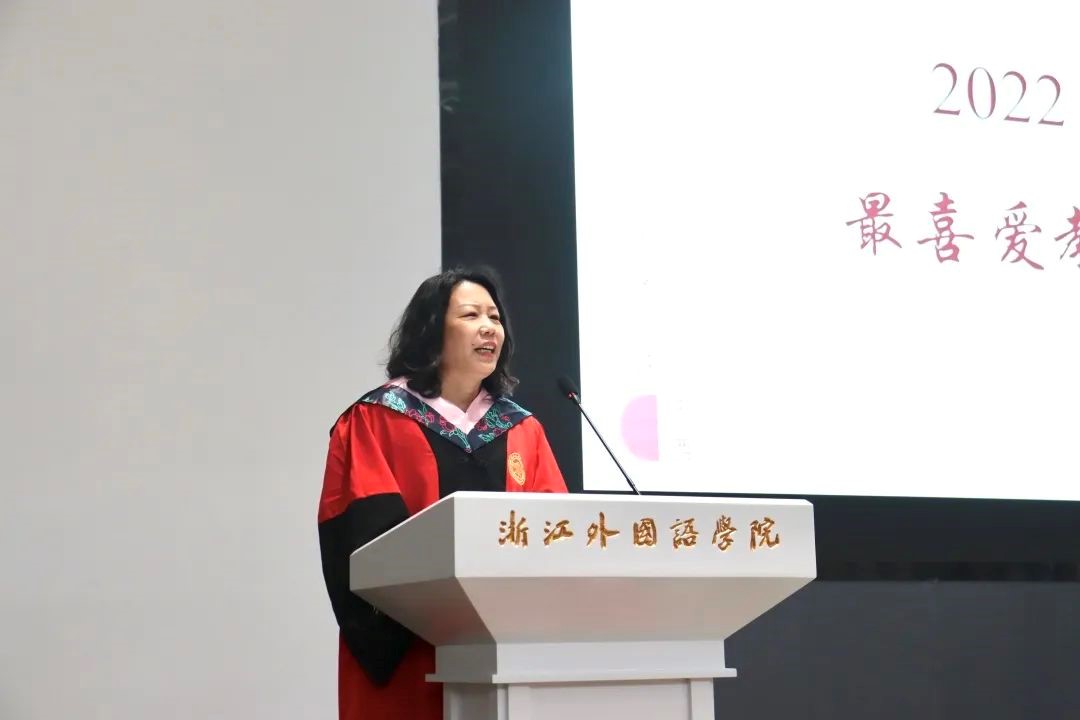 2022届18德语1班毕业生汪一瑶的母亲姚智英,作为家长代表发言。姚妈妈在发言中,向学校、学院和老师们对学生成长发展的倾注表达了真挚感谢,并嘱托同学们传承浙外精神,成为有责任、善担当、懂感恩的浙外人,用做更好的自己来感恩母校、回馈社会!