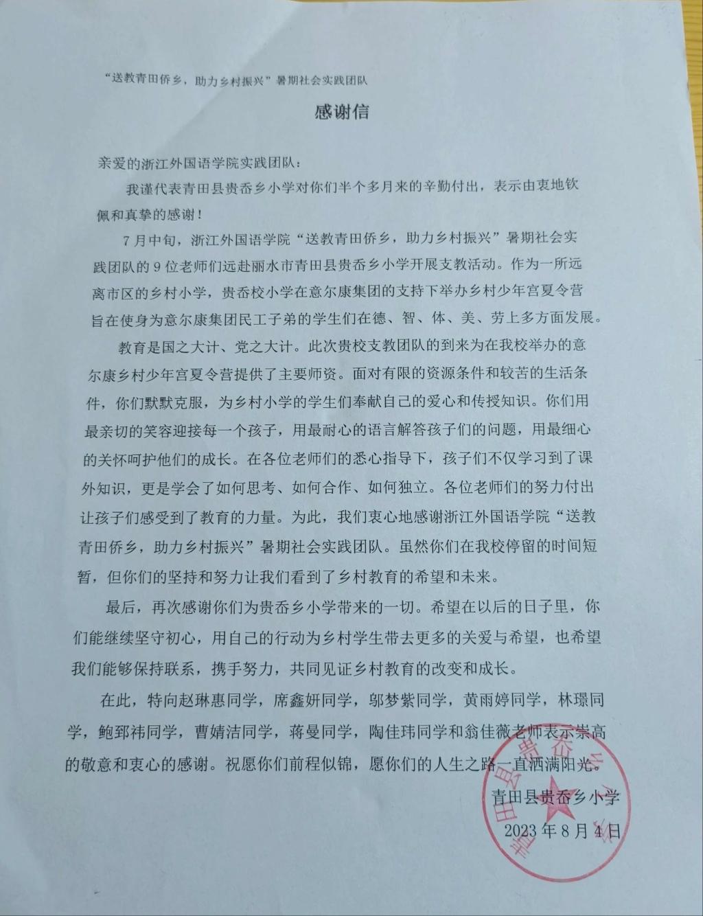 翁佳薇老师带领的浙外大学生团队,来到丽水市青田县贵岙乡小学,开展了为期20天的暑期社会实践活动。在这里,他们为129名意尔康员工子女——一群在暑期从全国各地奔赴而来的“小候鸟”,带来传统文化和国际视野课程,让“小候鸟”们在父母辛勤工作的这一片热土上,感受到更温暖、更多元的关爱和引领!