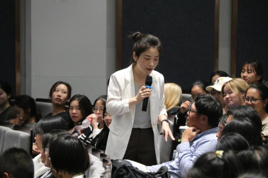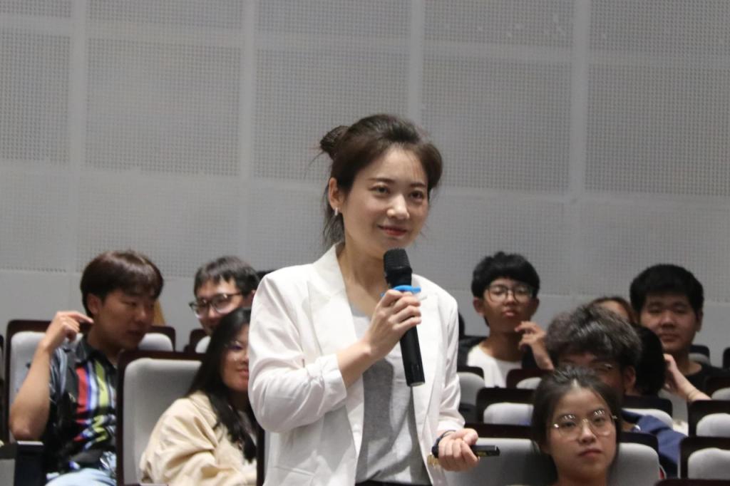 接下来,毕莹书记分别从“一个探讨、两种未来、三对关系、四项行动”四个方面和学子们共同讨论了“一个关于青春的话题”。在描述五种时间视角的利弊后,毕书记告诫学子们“一个人如何对待他的时间,决定了他可以成为什么样的人”,激励大家采取混合折中的多视角方式来平衡自己的学习和生活,最终达到“心流”的状态,专注于当下。接着,毕书记又以亲身经历为例,强调制定目标与提高执行力的重要性,以此积极迎接远和近这两种未来。毕莹还提出,人应建立好与自我、他人及世界的联系,积极融入党组织,投身到社会主义现代化建设中。