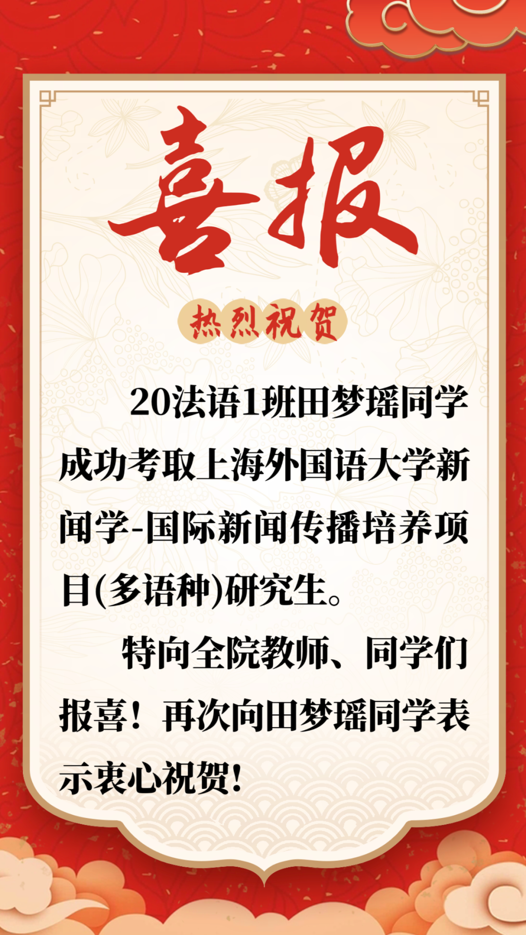 20法语1班田梦瑶成功考取上海外国语大学新闻学-国际新闻传播硕士研究生培养项目(多语种)(24年升学第2期)