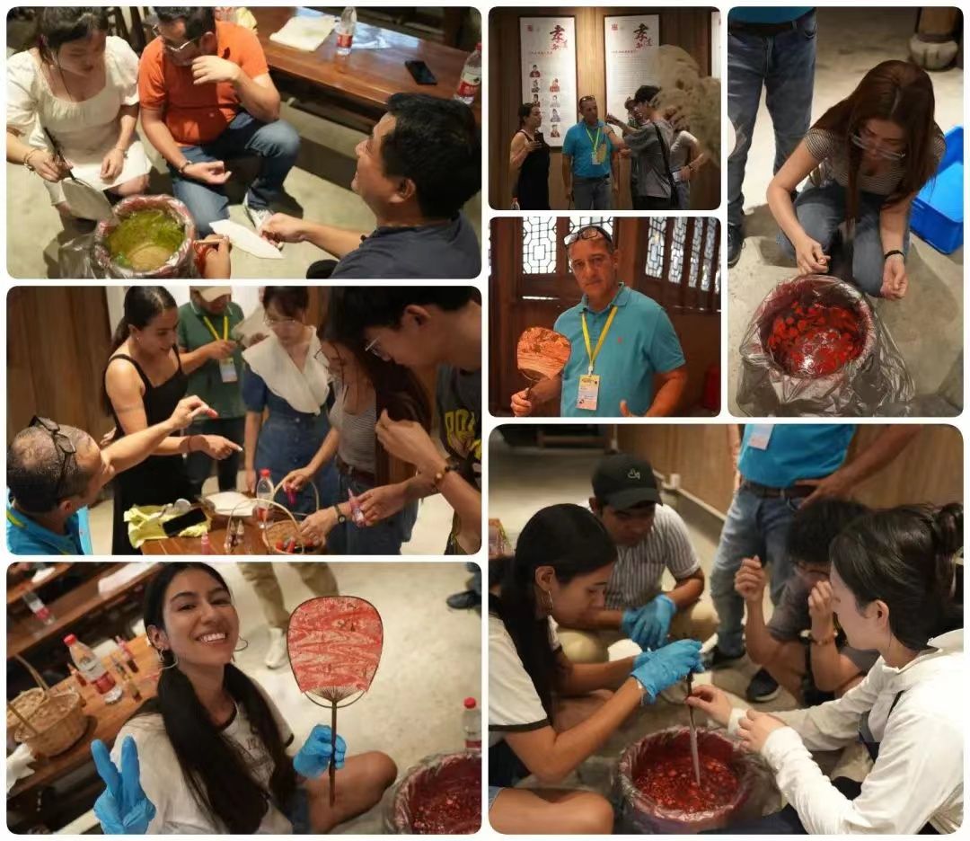 步入非遗体验馆,学员们无不感叹于融合“漆艺精髓”与“扇韵之美”的艺术瑰宝:漆扇。在老师的讲解演示下,学员们满怀期待,流露出跃跃欲试的神情,“调色、滴墨、上色、烘干、定型”,一道道漆扇制作工序有条不紊。“原来扇子不仅有拂暑送凉的功能,还蕴藏着深刻的中华美学价值!”学员Wendy赞叹道。“这简直就是魔术!未曾想,扇子竟能以如此精妙的方式被赋予新生命,中国匠人的智慧与技艺举世无双!”学员 Gina难掩激动之情地说道。