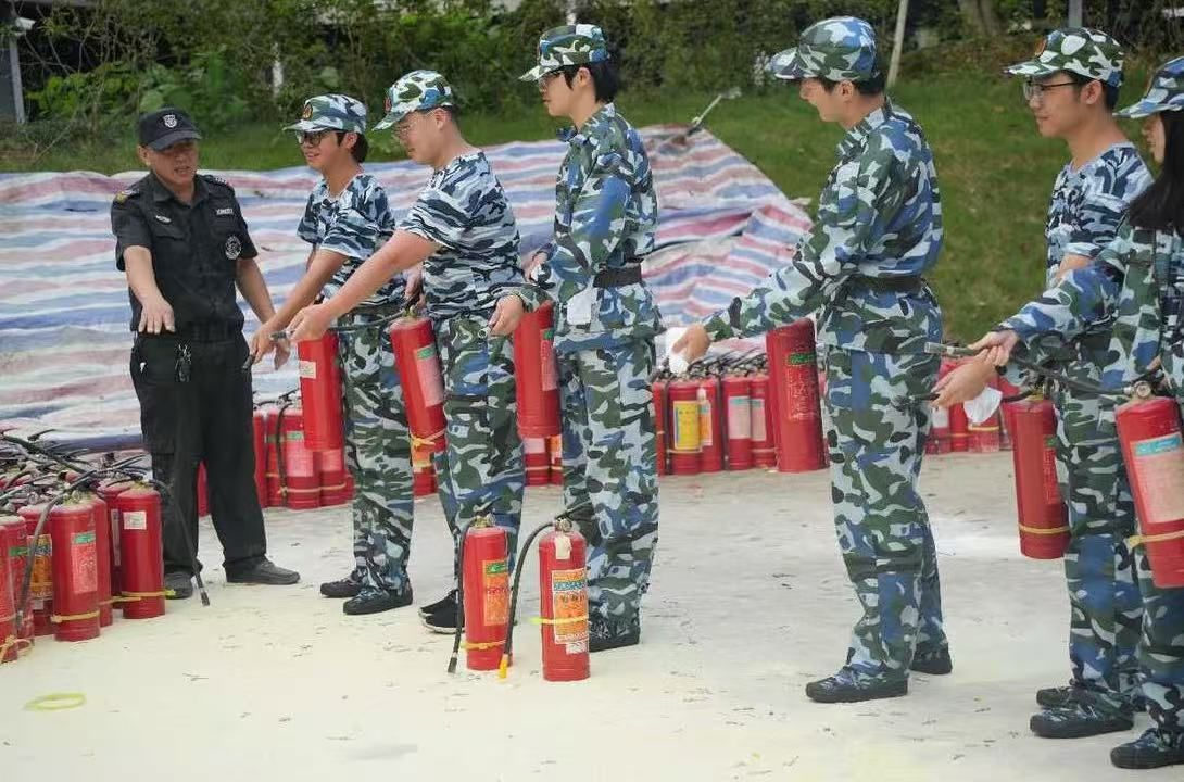 演练前,新生还学习了灭火器等常用消防器材的使用。