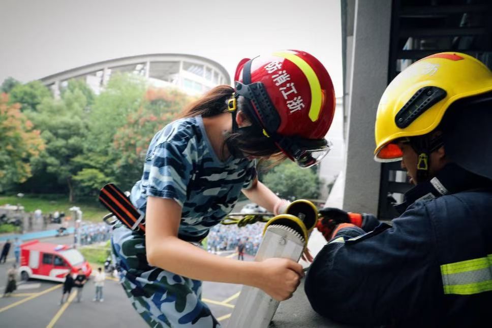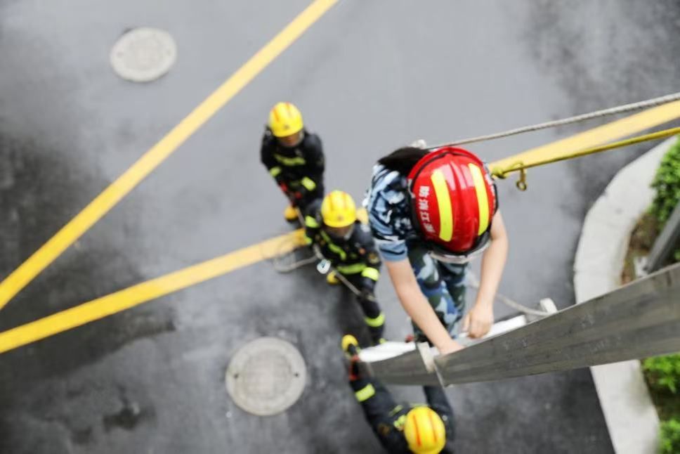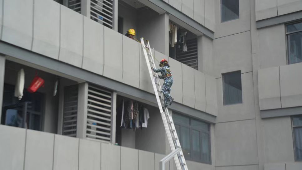 在高层逃生与救援演练中,四名新生学习并掌握了云梯与绳索的正确使用方法,依次从阳台窗口登上云梯,紧握把手,迅速且稳定地抵达地面,并接受医务人员身体状况检。同时,新生们还进行了急救知识与技能培训。