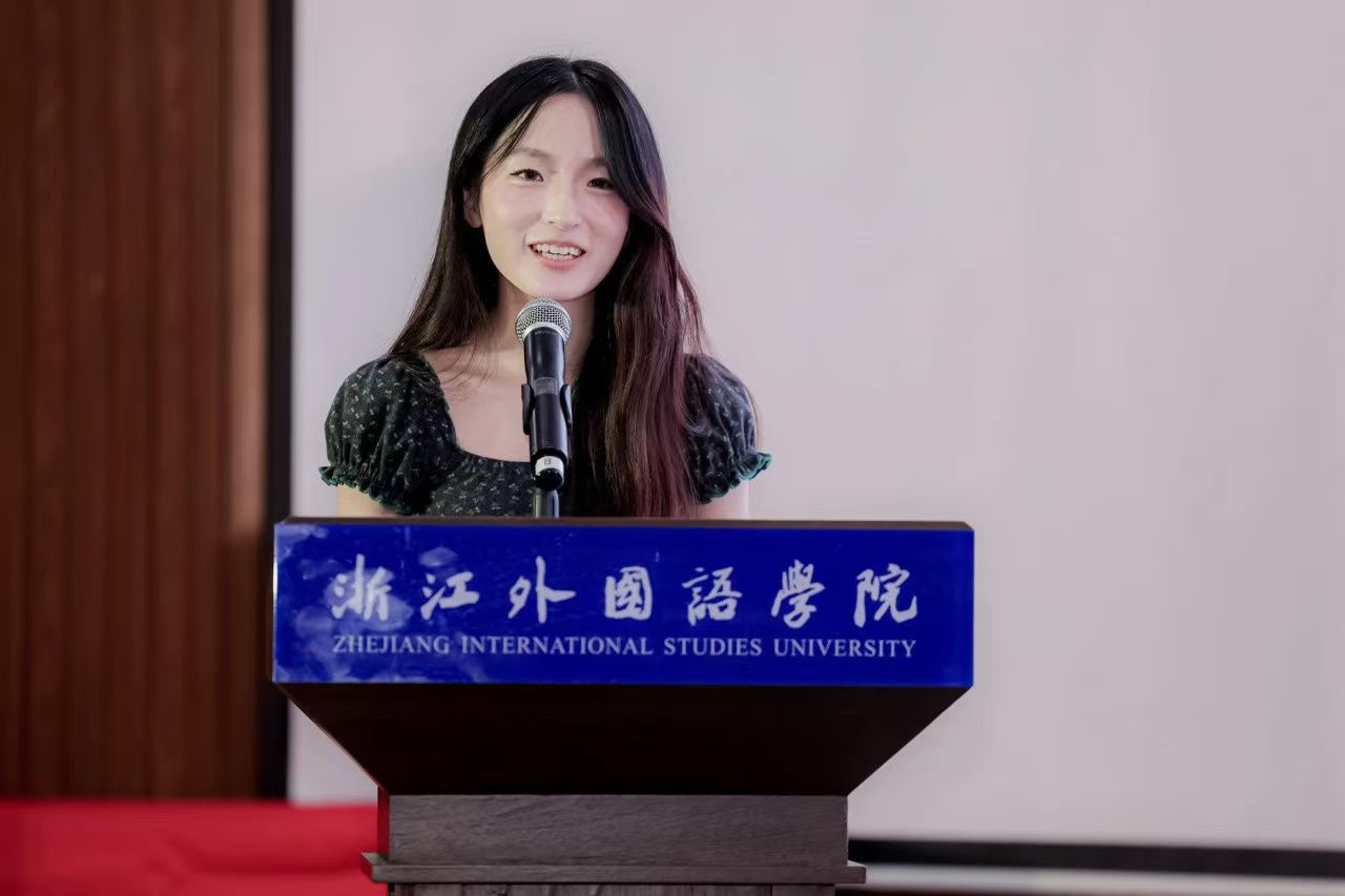 24俄语1班沈一诺作为新生代表发言。她分享了自己的大学四年目标以及对浙外的感受,号召全体新生要积极进取、不懈努力,立鸿鹄之志,做品学兼优之人。