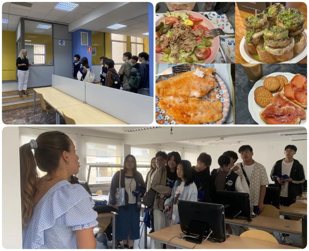 开学典礼结束后,旅游学院Noelia与María老师带领同学们参观了旅游学院的图书馆、休息室、秘书处等基础教学设施。学校位于萨拉戈萨市中心,这里不仅交通便利,周边生活配套设施也十分齐全。在寄宿家庭的帮助下,同学们很快适应了当地的作息习惯、上学路线以及交通卡的使用方式,还品尝了许多寄宿家庭为同学们准备的当地美食。