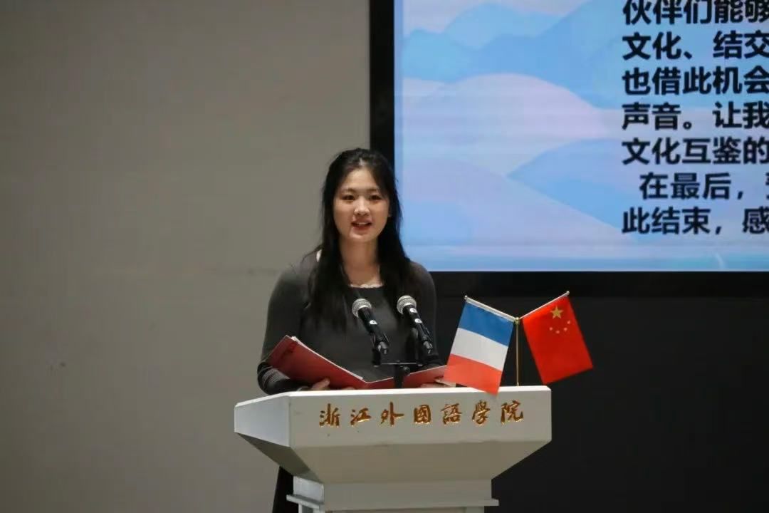 柴改英向远道而来参加本次“汉语桥”的全体师生表示热烈欢迎,表示今年是浙外第8次接待“汉语桥”法国团,非常高兴在杭州最美的季节,与大家相聚浙外校园。