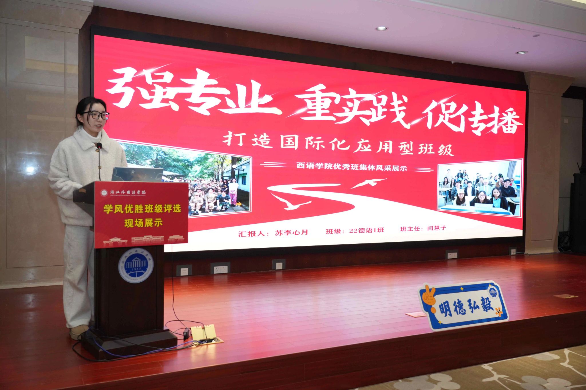 22德语1班、22西语中外1班分别以《强专业 重实践 促传播—打造国际化应用型班级》《以“讲好中国故事”为使命,建设“专精特新”国际化班级》为题,荣获学校“学风优胜班级”称号,充分展示了低端影视