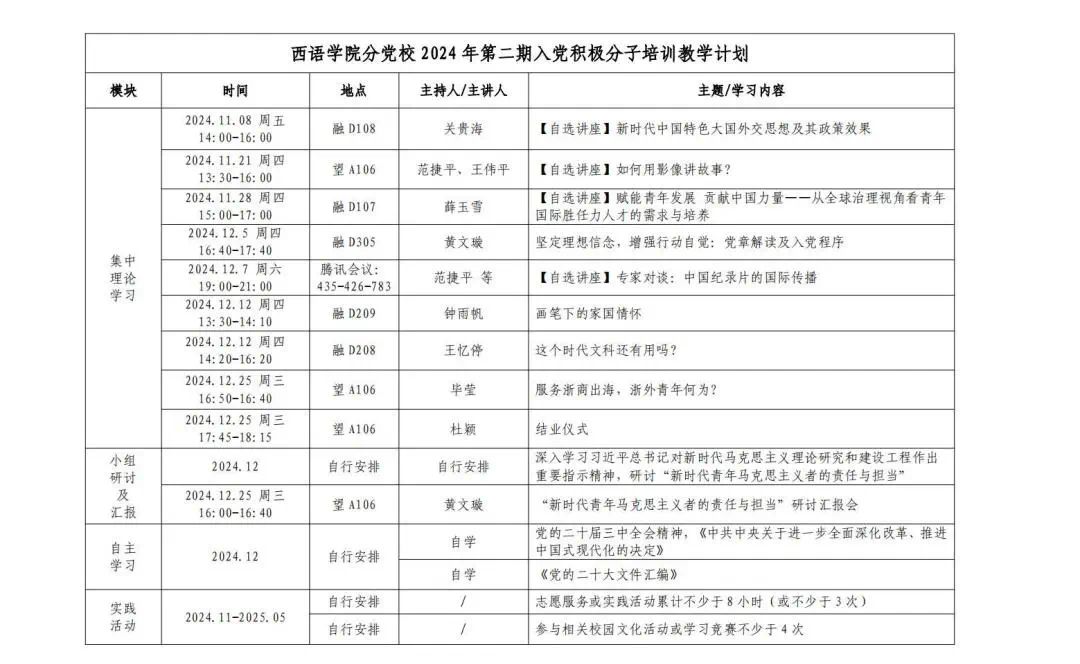 组织入党一生一次,思想入党一生一世。2024年入党积极分子培训班虽已告一段落,但是学习永远在路上。聚是一团火,散是满天星,希望每一位从分党校走出去的学员,都能带着这份收获和成长,以此次培训为新的起点,以更加饱满的热情和更加坚定的信念,投身到今后的学习和工作中去。