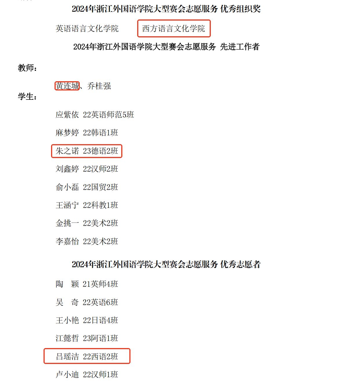 获评2024年度学校大型赛会志愿服务优秀组织奖,辅导员黄连城、23德语2班朱之诺获评先进工作者,22西语2班吕瑶洁获评优秀志愿者。