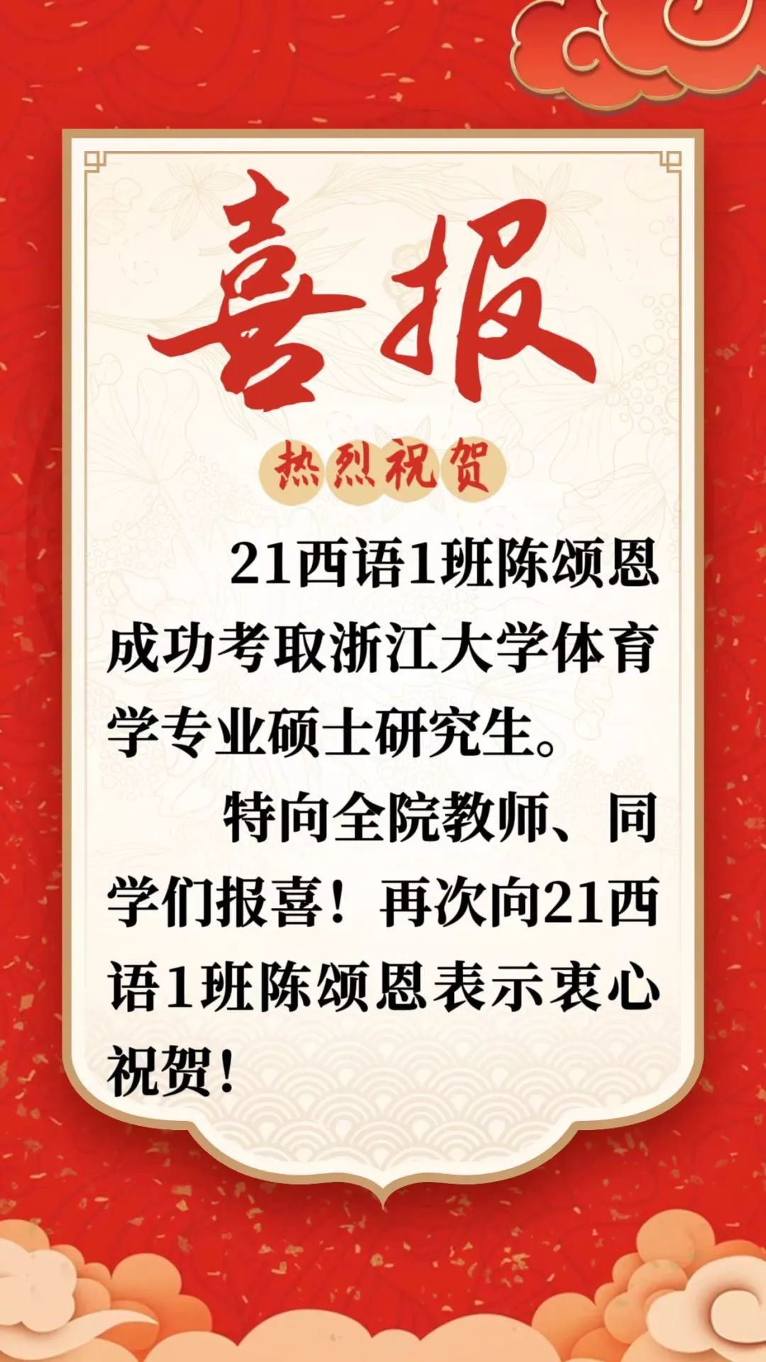 荣誉喜讯 | 21西语1班陈颂恩成功考取浙江大学体育学专业硕士研究生(25年国内升学第19期)