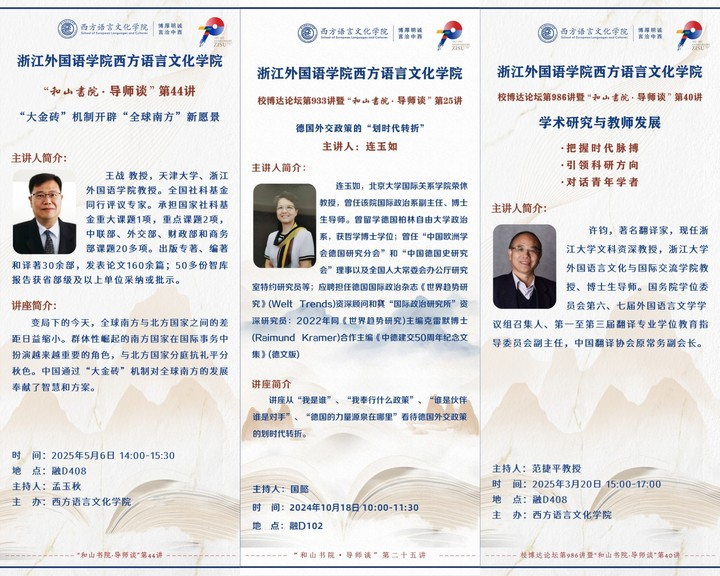 成立于2014年,现有俄语、西班牙语、德语、法语、意大利语、葡萄牙语、捷克语、波兰语8个语种和10个专业(含西班牙语中外合作办学、意大利语中外合作办学),共有在校学生1000余人。以“博厚明诚 言洽中西”为院训,着力培养具有家国情怀、国际视野,能在外事外宣、外贸文旅等领域担当促进文明互鉴和人文交流之大任,能讲好中国故事、浙江故事的高素质国际化应用型人才。