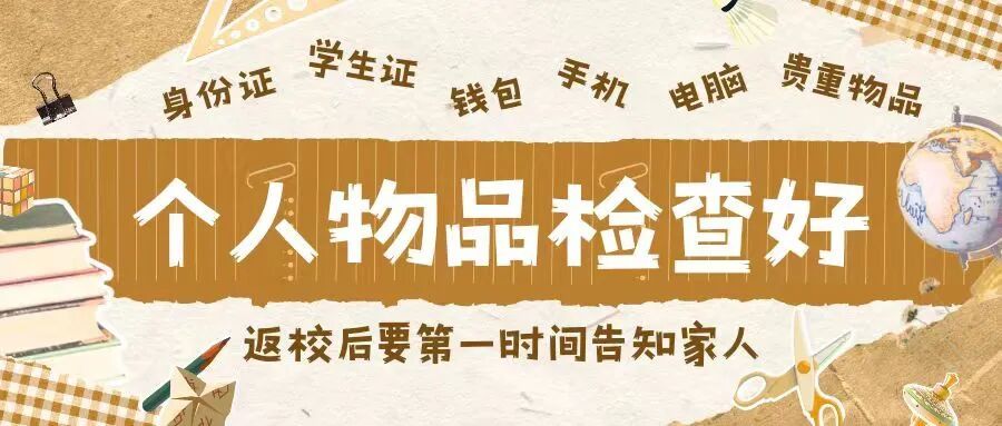 个人物品出发前一定要检查好,如身份证、学生证、钱包以及手机等贵重物品,证件放在随身口袋中以防丢失,途中保持通信畅通,及时和家人、辅导员老师通报行程。返校后要第一时间告知家人,做到顺利返校。