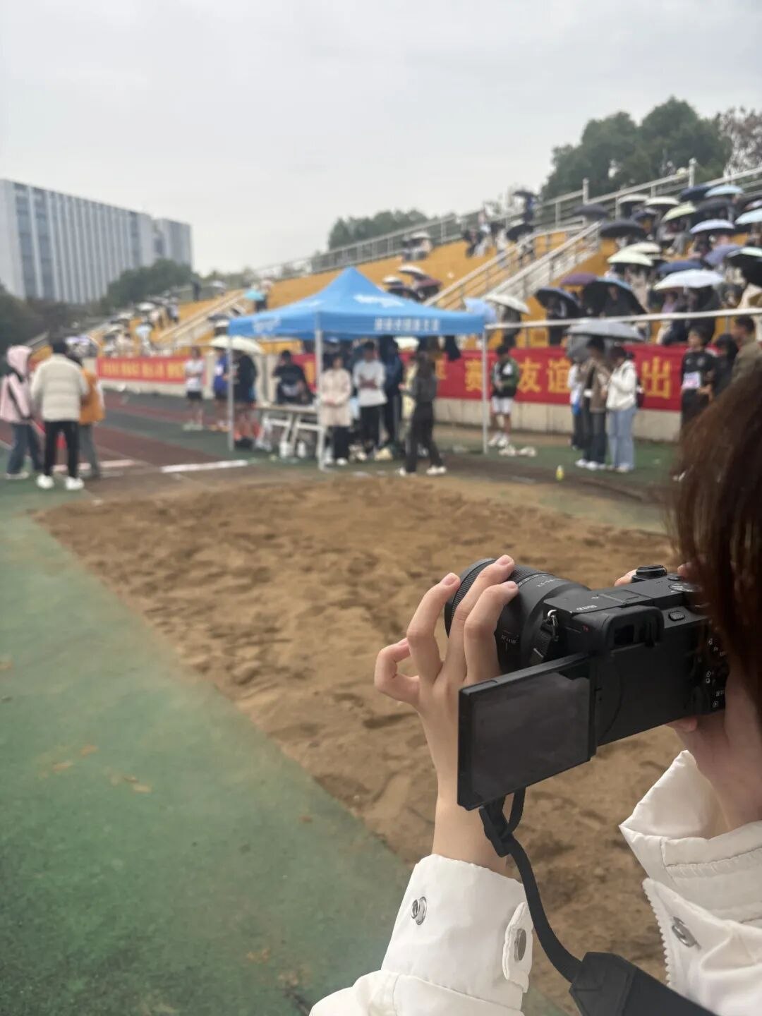 视创部负责人章芷琪永远记得那个阴雨绵绵的迎新早晨。她透过取景框记录着新生羞涩的笑脸、家长的叮咛和志愿者忙碌的身影。在行健馆拍摄时,毕莹书记称赞了他们的敬业,并为他们留下了一张工作照。