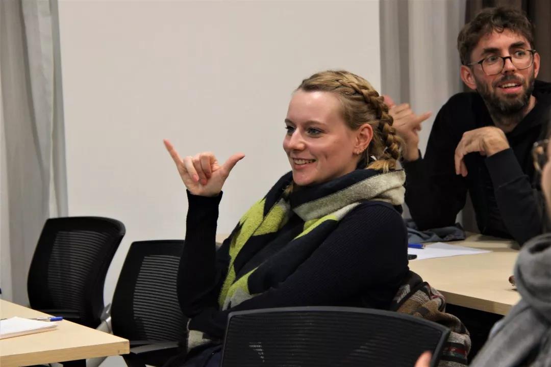 课堂中,各国的老师们对中文表现出了极大的兴趣,他们跟随着两位小老师学习了“你好”“谢谢”“再见”等简单的生活用语,以及数字和常用句型的表达。拥有多年的语言教学经验,融会贯通中,老师们不仅很快学会了许多中文的日常表达,还注意到了中文同音字、轻声、声调等特点。他们不断向两位同学提问,希望了解更多关于汉字的知识及其背后的蕴意。