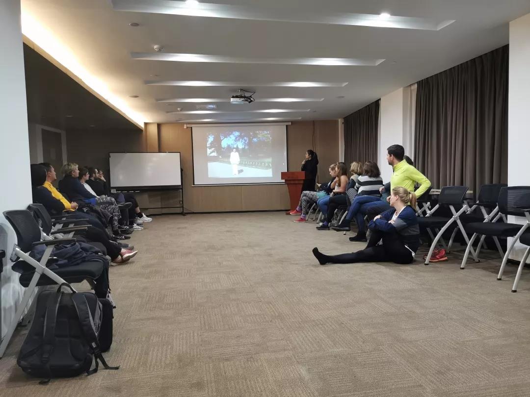 活动中,同学们简单讲解了太极拳的种类,并组织教师们观看了太极拳的表演视频。接着,同学们向在座的老师们展示了传统的太极剑法,并带领他们学习了太极拳简化套路“八法五步”的基本招式。招式刚中带柔,动中有静,一招一式恰似行云流水,充分表现了中华武术的魅力。各国老师带着极大的兴趣,摩拳擦掌、跃跃欲试,积极地参与其中。