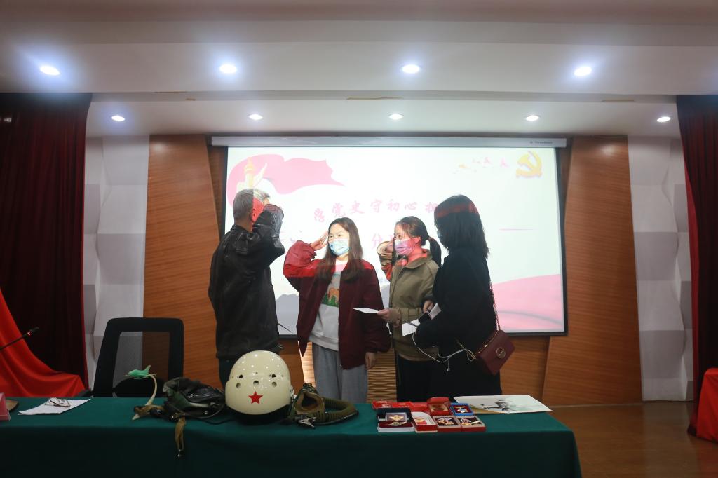 入党积极分子魏浩博穿戴好装备。魏浩博向老人敬礼,向先辈表达新一代青年的敬意。现场响起雷动掌声,是对两代人传承的祝愿。曾服过2年的兵役的学生党员李毅诚说道:“我听了老人的故事深有感触,当年我就是在征兵标语中感到了国家的号召和需要,所以选择去服兵役。”同学们为赵兹云老人送上了鲜花和明信片,表达真诚的敬意。