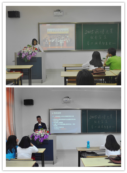 5月7日下午,在教学楼414,“首届世界互联网大会志愿者服务先进个人”蒋书浩,“第十届葡语诗歌朗诵比赛亚军”林文捷,“2015法语歌曲大奖赛上海赛区总决赛一等奖”获得者宫烨,以及校级优秀团组织干部刘嘉男五位同学给学弟学妹们分享了他们的学习经验。除了平时的语言学习方法外,他们还用诙谐的语言把自己的留学以及考研的经历向同学们娓娓道来,同学们也积极地向他们询问了困扰着自己的一些问题,整个分享会在轻松愉悦的氛围中圆满结束。