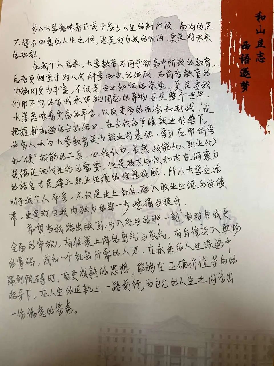 20俄语1班的赵芮笛这样写:“我要永远保持着心中那团炽热的火焰包裹着的梦想。做一个全面发展的人,就要付出比别人更多的努力。”