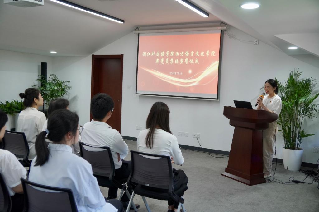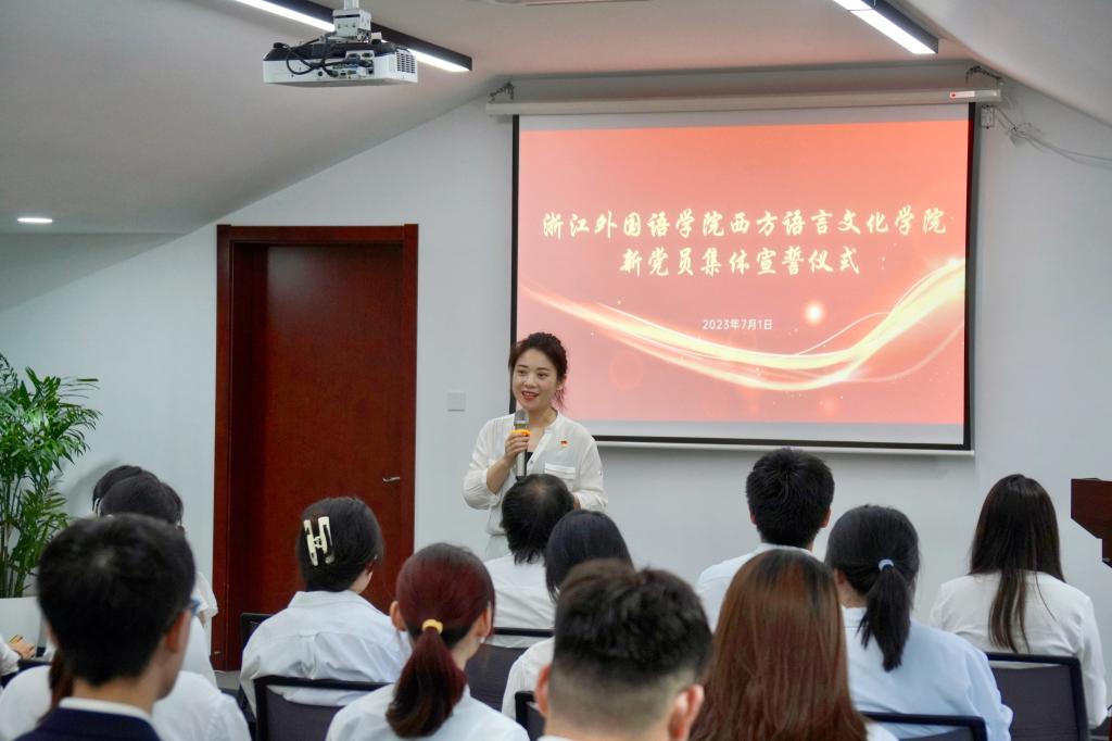 “在建党102周年的时候,学习青年运动和优秀青年故事让我对青年一代的使命职责理解更为深刻,在宣誓仪式各环节后,我也进一步认识到作为刚入党的青年学生,应该把党的先进思想内化于心,外化于行,同时,结合自己的专业学习,充分发挥外语学子的意义与价值,为群众做出表率,发挥党员的先锋模范作用,在自觉接受监督的过程中不断进步,努力成为一名真正且优秀的共产党人。”徐超向现场的新党员们提出倡议,“我们要坚定理想信念,学习党的理论,做党的政策的宣讲员;诚实守信,严于律己,做优良学风的推动者;投身实践,甘于奉献,做大学生的引领者”。
