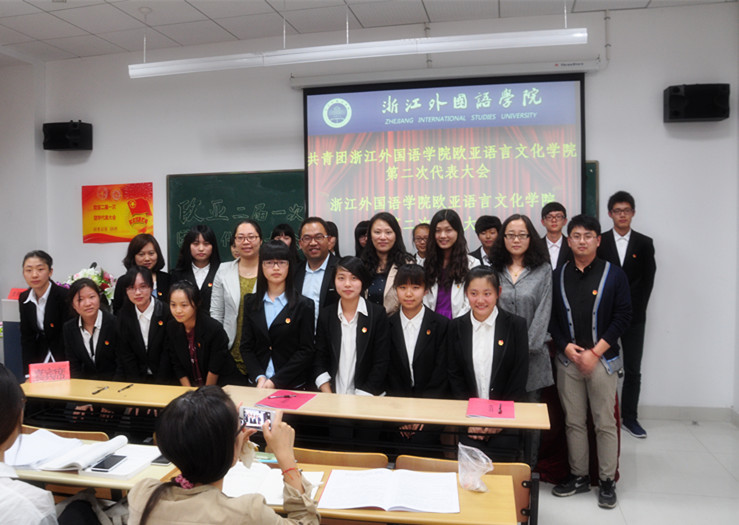 10月13日16时,欧亚学院第二次团学代表大会在艺术楼A504隆重举行。校团委副书记邵振丽、欧亚学院党总支副书记周明宝出席会议,英文学院团委书记邱萍、艺术学院团委书记郝菲菲、浙江省工商银行系统共青团干部沈涛,校学生会主席助理骆洪文烨同学受邀参加会议,欧亚学院辅导员赵惠、陈和健老师,以及来自全院33个班级的51名团代表、53名学代表参加会议。