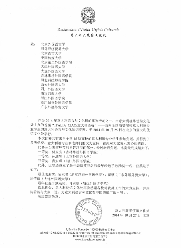 10月25日,由意大利驻华使馆文化处主办的首届面向全国高等院校意大利语专业学生的语言与文化知识竞赛——“ITALIA CIAO/意大利语桥”在北京举行。本次比赛吸引了北京外国语大学、广东外语外贸大学、北京语言大学等全国15所高校的意大利语专业学生参加。