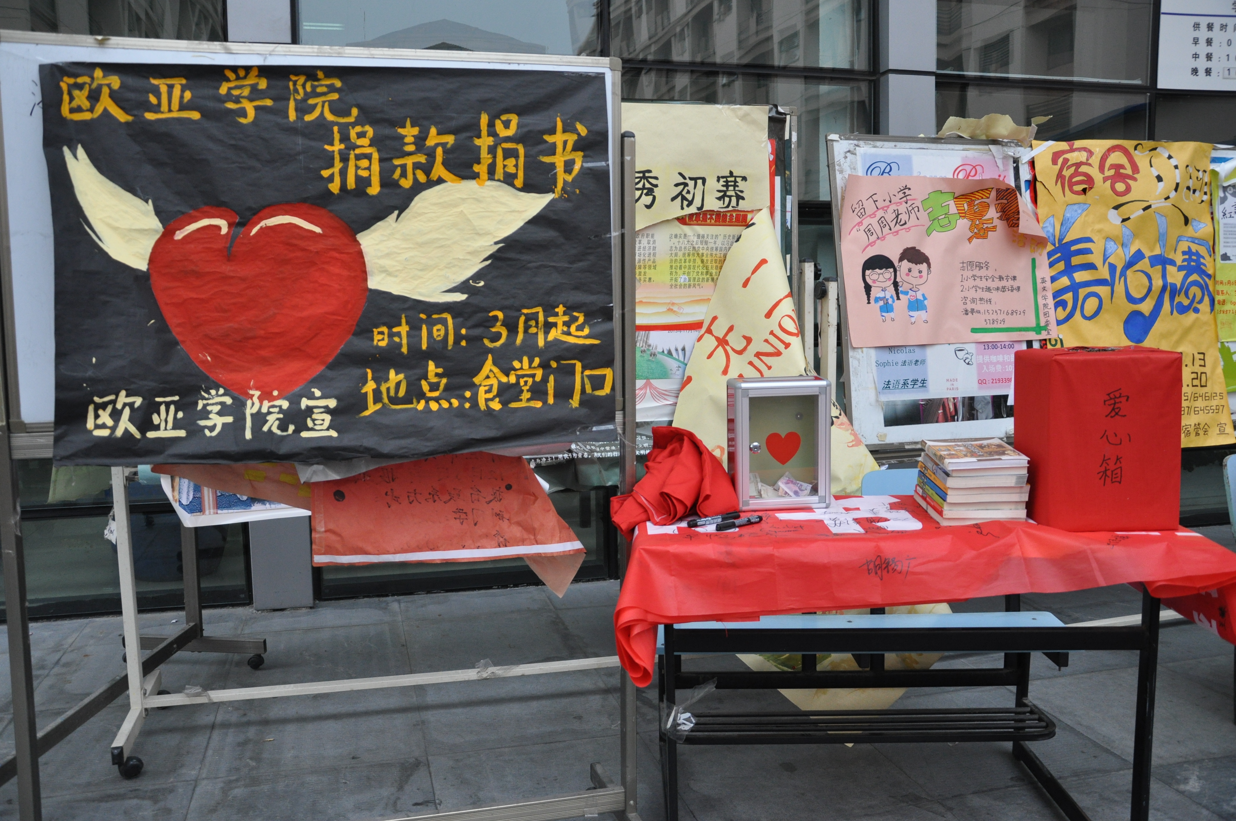 活动当天,志工办的同学们拿着准备好的爱心箱,还有签名横幅去每一个教室进行宣传,并且接受现场捐赠,同学们都积极参与,甚至还有学院的老师也参与了捐书活动,现场气氛很高,一角钱,一本书慢慢积累,食堂门前,也设置了爱心箱,吸引其他学院的同学也参与进来,截止至21日,爱心箱里已经塞满了书籍和零钱,横幅上也留下了同学们的签名。