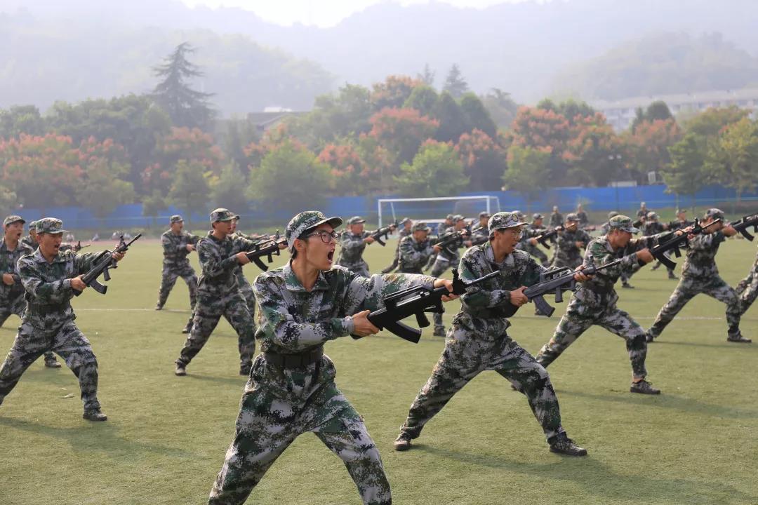 121位同学组成的三连方阵大踏步向前。在三连教官们的严格训练下,经过14天的磨砺,同学们俨然练就了军人般的英姿。他们顶着骄阳,踩着鼓点,怀着热血,骄傲地接受着校领导们的检阅。分列式结束后,是学子们的刺杀操表演和教官们的军体表演。