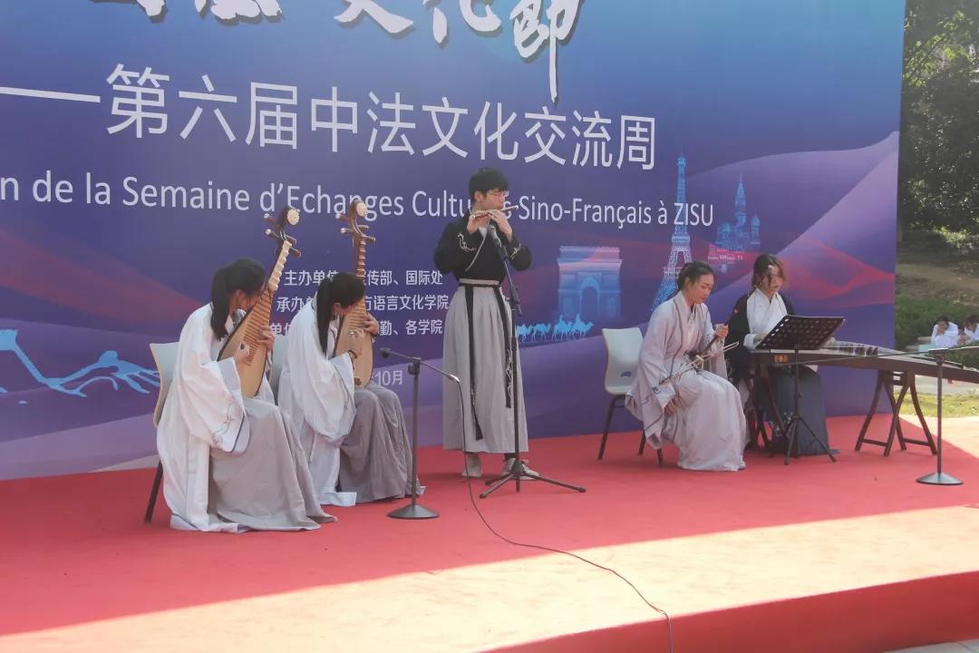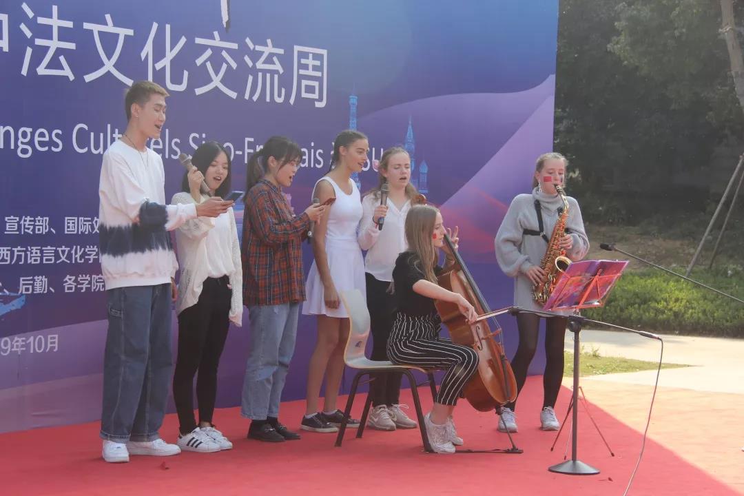 随后,中法双方学生带来了精彩纷呈的文艺表演。舞狮、武术、汉服秀、民乐合奏、传统舞古韵盎然,法语专业学生的法语歌曲合唱、法国学生带来的汉语小品、中法学生合唱《女人心》《小幸运》洋味十足,还有赤道几内亚学生带来充满非洲韵味的歌舞剧掀起了一波波高潮。中法学生合作书写了“祝贺中法建交55周年、中法青年友谊长存”条幅,为本次活动点亮了主题。