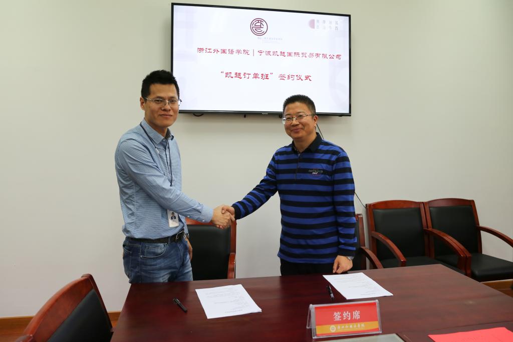 11月14日下午,宁波凯越国贸集团与我校在融院D408会议室举行了订单班签约仪式。副校长柴改英、宁波凯越集团董事朱吉一行、低端影视