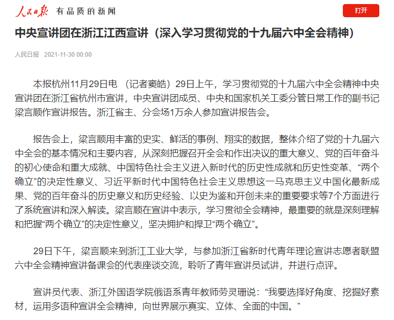 人民日报要闻4版关注活动并报道了劳灵珊老师的参会感悟:“我要选择好角度、挖掘好素材,运用多语种宣讲全会精神,向世界展示真实、立体、全面的中国。”