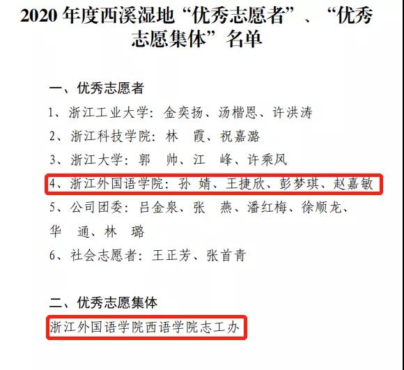 学院团委志工办荣获“2020年度西溪湿地优秀志愿集体”荣誉称号,彭梦琪、孙婧、赵嘉敏、王婕欣四名同学荣获“2020年度西溪湿地优秀志愿者”