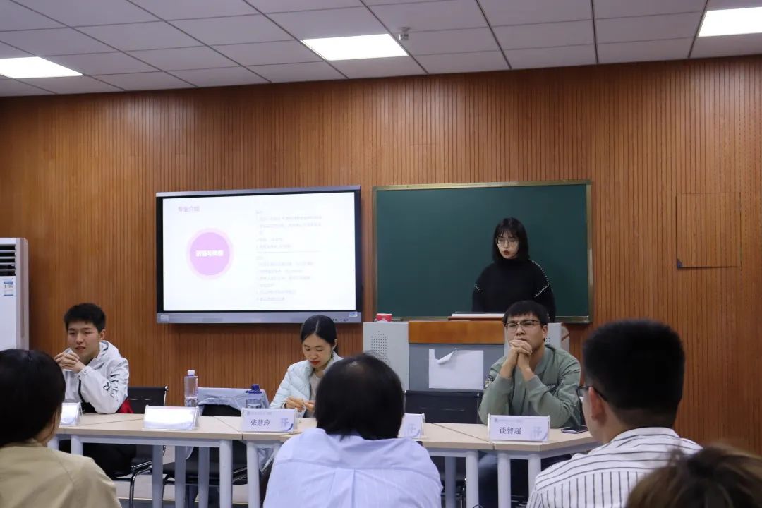 在在校生分享环节, 18德语1班谈智超同学分享了他独特的经历:大学期间入伍,复学后重新就读大一,大三时去德国交流,现在他已被浙江大学体育人文社会学专业录取,他结合自己的经历与兴趣介绍了自己选择跨专业考研的原因和经验。