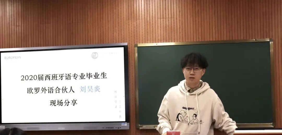 2020届西班牙语专业毕业生、欧罗外语合伙人刘昊炎学长,在现场结合自己合伙创办欧罗外语的经历,分享了他的创业故事,还介绍了小语种专业求职者在面试以及合作过程中可能需要避免的问题。