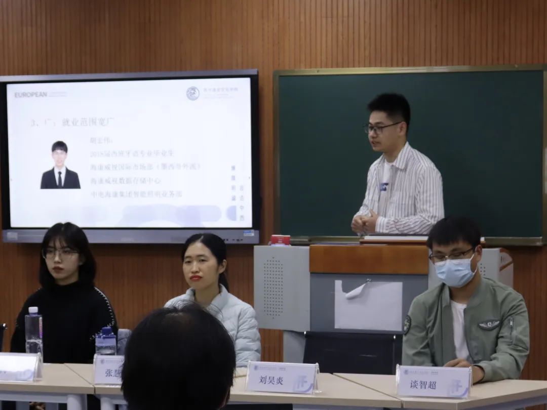 2018届西班牙语专业毕业生、现就职于中电海康集团的胡宏伟学长,通过视频方式介绍了自己入职海康威视公司的前期准备、发展现状以及未来方向。