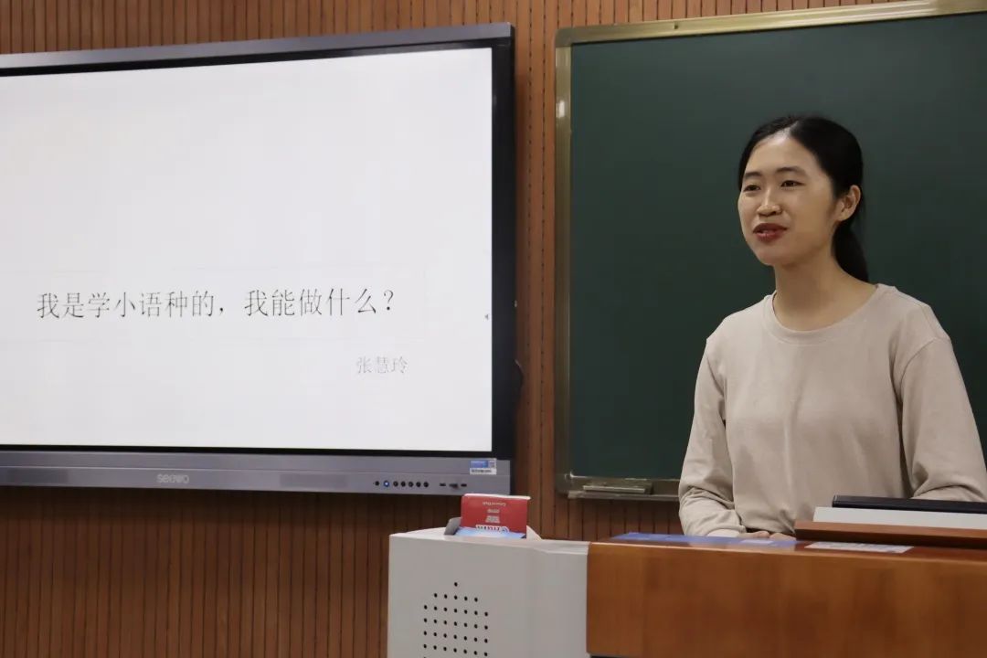 在专业教师分享环节,张慧玲老师作《我是学小语种的,我能做什么?》主题发言。她介绍了自己从对波兰语完全陌生到成为一名波兰语系专业教师的经历,还结合自己对波兰语系毕业生就业选择的观察与调研,为大家介绍了小语种专业学生多样化的就业选择。