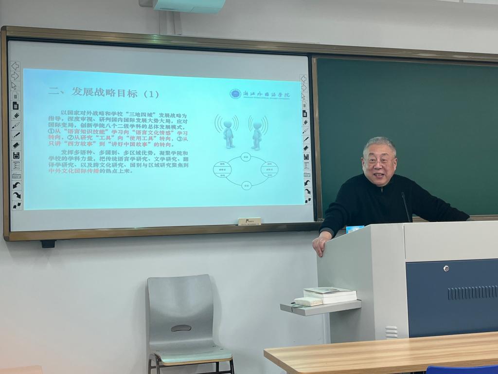 范捷平指出,人工智能的迅速发展对传统语言人才培养提出了巨大的挑战,学院要善于变革与创新,新形势下打开思路,实现从“语言知识技能”学习向“语言文化情感”学习的转向,从“研究工具”向“使用工具”的转向,从讲“西方故事”到“讲好中国故事”的转向。他认为,学院要发挥多语种、多国别、多区域的优势,凝聚学院和学校学科力量,把传统语言研究、文学研究、国别区域研究、翻译研究和跨文化研究聚焦到中外国际传播热点上来。
