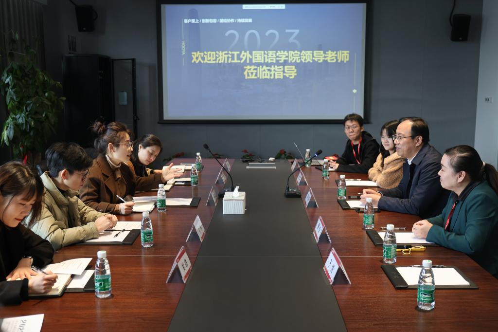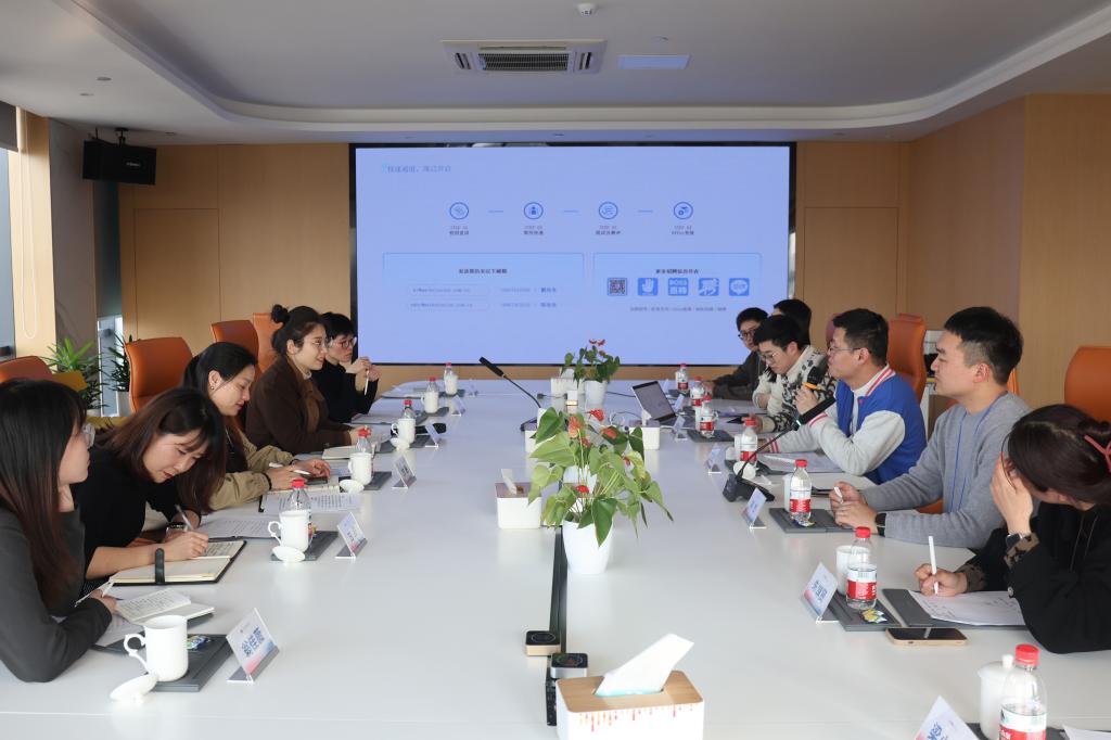 豪雅集团走访期间,集团常务副总裁蔡井泉,互联网事业部副总监陆依靖、人力资源部经理黄佳、校招经理陈斌煜,学院2021届校友楼成旺以及2023届实习生代表等,共同会面并进行交流。