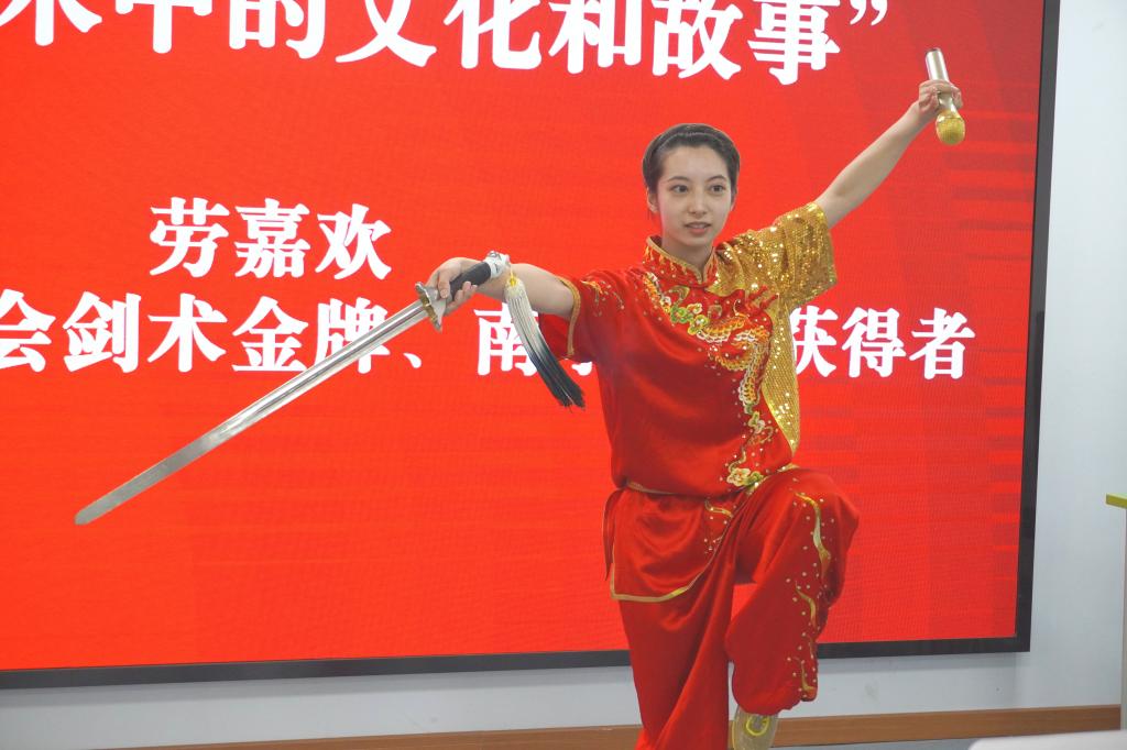 来自西班牙语专业的劳嘉欢同学,是浙江省大学生运动会剑术金奖和南拳银奖获得者。她在现场展示和分享了自己对中国传统武术的文化和故事的理解。“剑术中‘提膝点剑’这个动作,其中的精髓,可以用‘姜太公钓鱼’的心境去施展;‘并步点剑’的动作则体现出‘蜻蜓点水’时的轻盈感。而拳术中‘提膝亮掌’的动作,需要以‘金鸡独立’中公鸡的机警神态来诠释。这就是武术中形神合一的理念,也是中华文化的重要内容之一。”