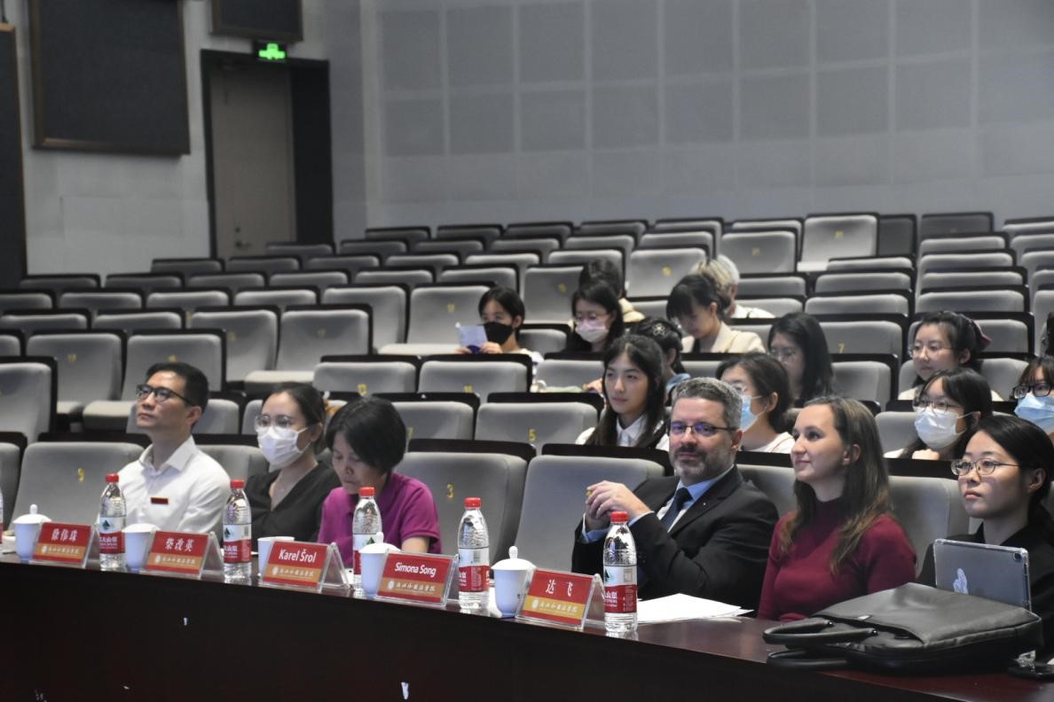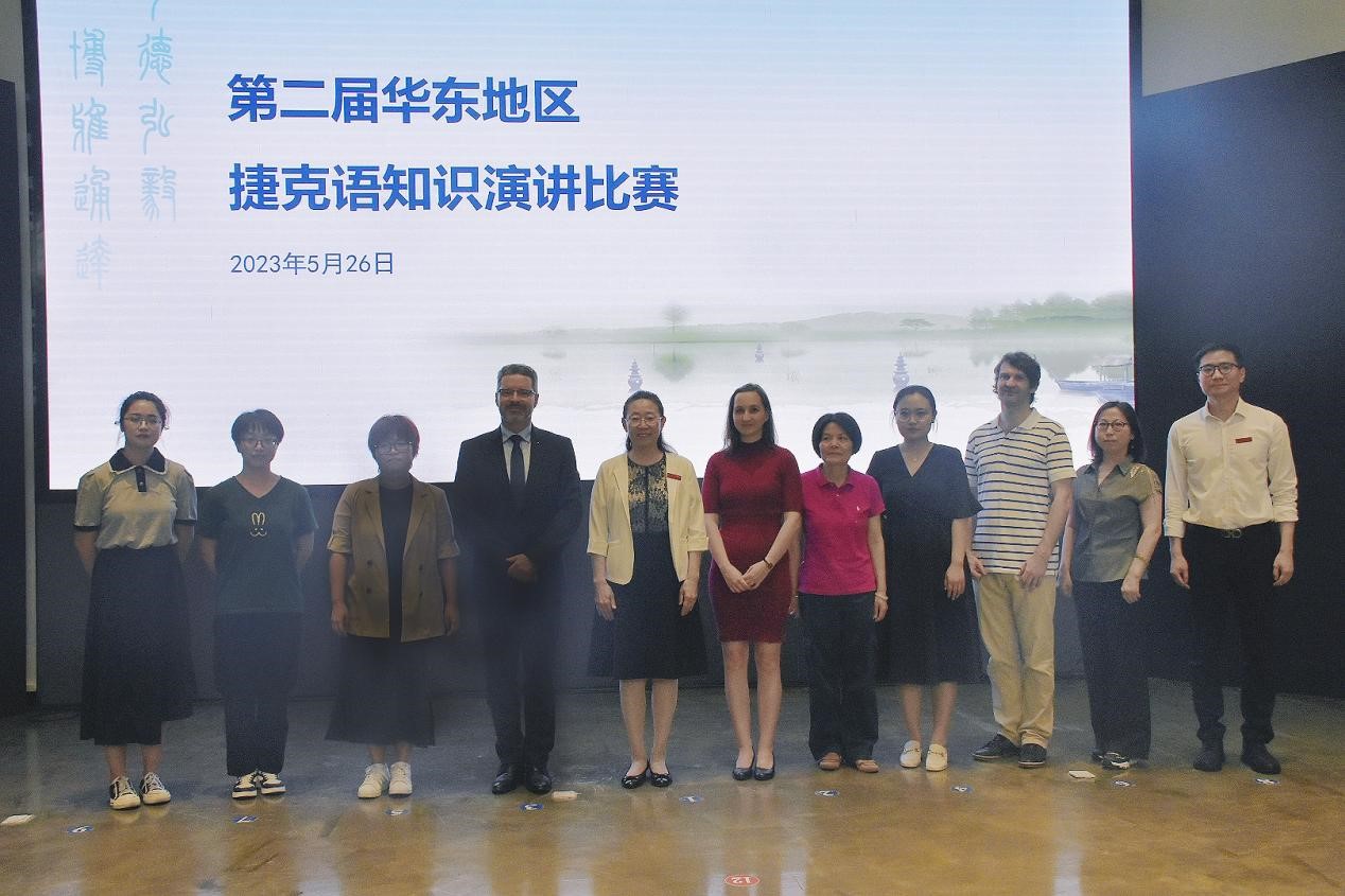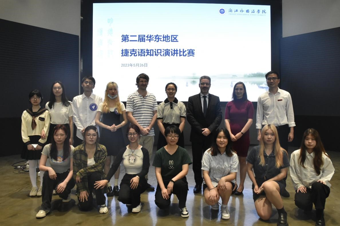 2023年5月26日,由我校主办的第二届华东地区捷克语知识演讲比赛决赛圆满落幕。20位来自上海外国语大学、浙江越秀外国语学院和我校捷克语专业的优秀学生们,以“我与捷克的故事”为主题,多角度讲述语言及文化学习、中捷文化交流中的精彩故事。副校长柴改英教授、捷克驻上海总领事史诺(Karel Šrol)先生、捷克驻上海领事官员李琳(Simona Song)女士,以及来自三所高校的专业负责人、教师代表共同出席比赛。