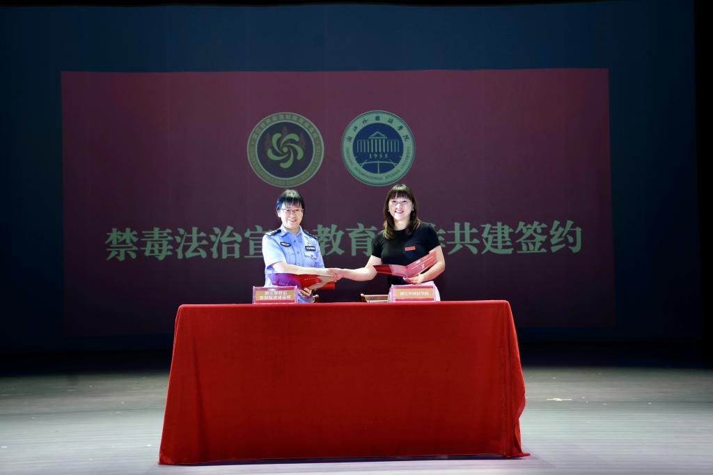 仪式上,省拱宸戒毒所副所长与我校人武部、保卫处负责人代表双方单位共同签订禁毒法治宣传教育合作共建协议。
