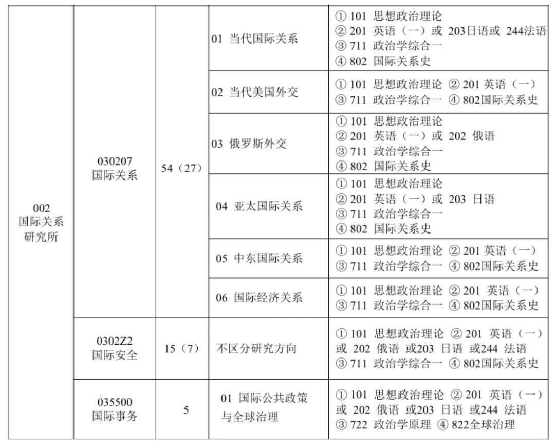 外交学院国际关系研究所是国内最早从事国际关系教学与研究的单位之一。研究所现设有国际关系博士后科研流动站;政治学一级学科博士点,下设国际关系、国际政治两个二级学科博士点;设有国际关系硕士点,包括当代国际关系、当代美国外交、俄罗斯外交、亚太国际关系、中东地区研究、国际经济关系等研究方向;设有公共管理硕士(MPA)专业学位点。外交学院国际关系学科在2002年成为北京市重点学科,2011年荣获国家级重点学科称号,2017年进入国家“双一流”建设学科行列。国际关系研究所的教师分别兼任外交学院国际安全研究中心、欧盟研究中心、俄罗斯研究中心、美国研究中心、中东研究中心、金砖国家研究中心和国家软实力研究中心等主任的身份。