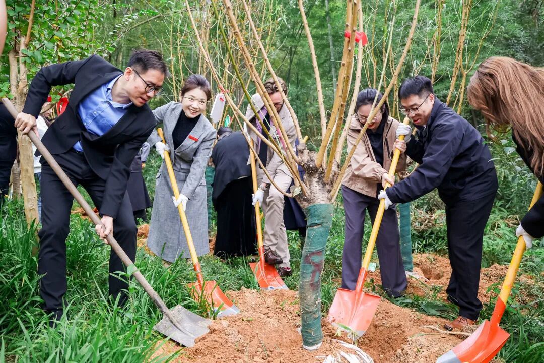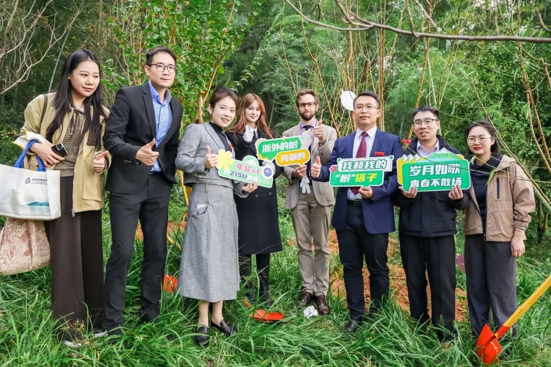 党委书记毕莹,副院长王忆停,党委副书记、纪委书记戴力,院长助理劳灵珊与校友代表,共同来到寻语山校友林,挥锹培土,为校园增添14份“新绿”。在这14棵校友树中,中法、中拉“友谊之树”苍翠挺拔,它们是浙外与法国汉语教学协会、英盖拉美产业园,自2014年建交以来,持续深耕人文交流、青年交流与教育交流的结晶。新苗扎根,见证的是校友们饮水思源、情系母校的赤子之心;林木成荫,诠释的是浙外已然成为校友归巢、重温往昔的诗意港湾。