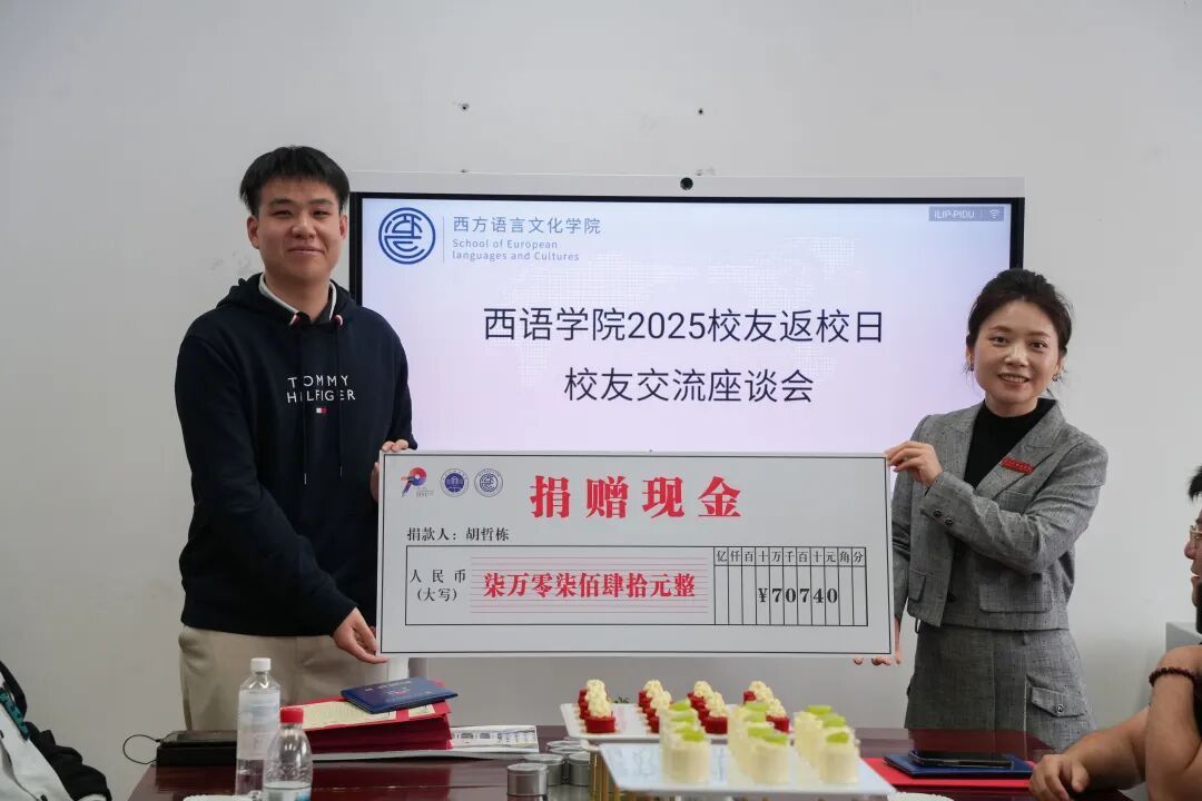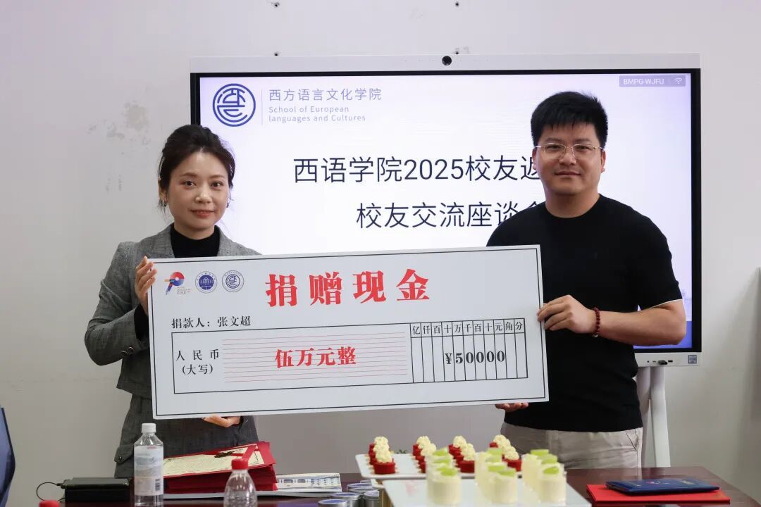 活动现场,学院还为爱心校友举行基金捐赠与行业导师受聘仪式。我校2011届理化测试专业校友、浙江富立邦无纺科技有限公司董事长张文超捐赠人民币五万元,以建立“超力量”训练营支持学生全面健康成长,并受聘为“学院行业导师”。2022届法语专业校友胡哲栋捐赠价值七万余元实物,用于学院困难学生特别资助项目。