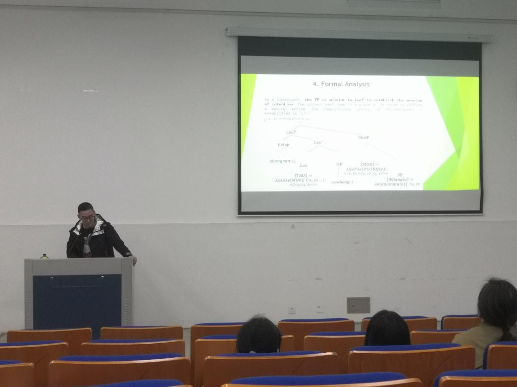 讲座上,王继新博士以湘语小龙门方言的动词前TAU为例,讲了在小龙门方言中,动词前语素TAU表示主语在说话时间前的某个时间点移动到某个特定的位置进行动作。此外,TAU的语义表达了以下两个基本含义:(1)主语的位置必须与TAU句中事件的位置不一致;(2)在说话时,主语已经离开了这个位置,所涉及的动作在一个水平上已经完成或终止。他认为,语义上的TAU充当一个位置谓词,通过利用事件位置和事件发起者的位置之间的非重合关系来实现事件锚定。它的过去时性解释和完成性的意义因而产生于处所的非巧合性。此外,TAU句突出了主语移动到某处的意向性,可以通过语用推理来加强。