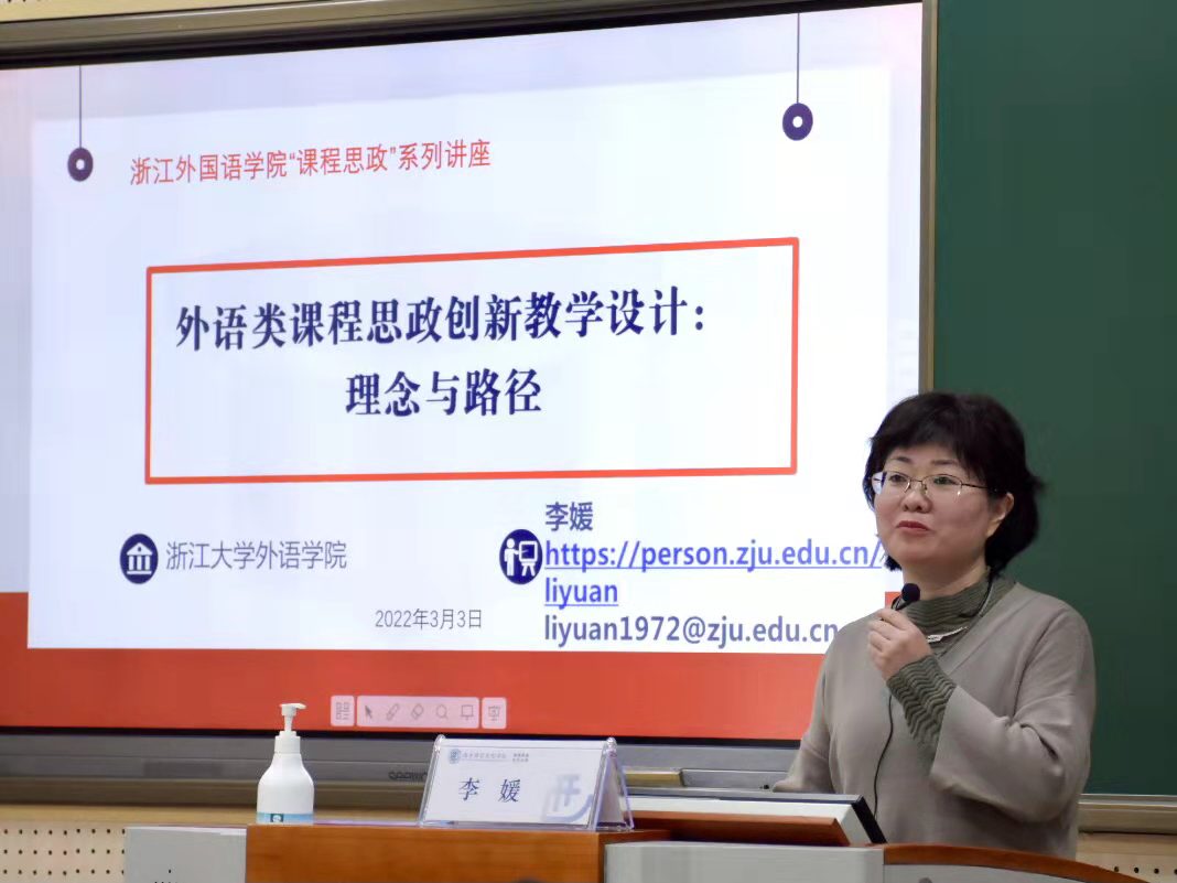 主办,教师教学发展中心、课程思政研究与实践中心协办的校课程思政系列讲座第一讲、暨西语“寻语大讲堂”第5讲在望D120举行。此次讲座主题为 “外语类课程思政创新教学设计:理念与路径”,主讲人为浙江大学外国语言文化与国际交流学院教授、博士生导师李媛教授。讲座由低端影视