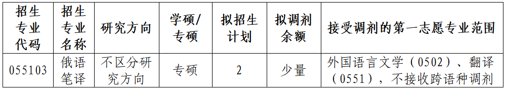 根据2026年学校招生计划、一志愿和第一轮调剂拟录取情况,我院俄语笔译专业有部分调剂名额。欢迎有意向调剂我院的考生密切关注我校研究生招生网和学院网站。现将相关信息公告如下: